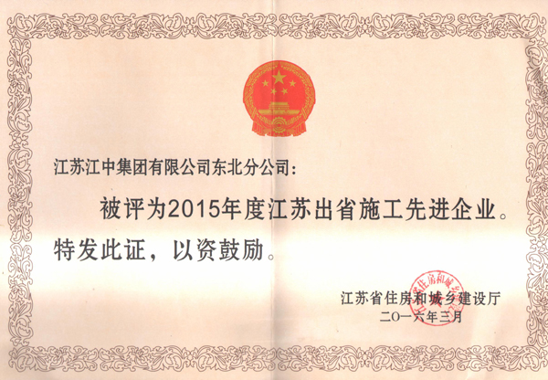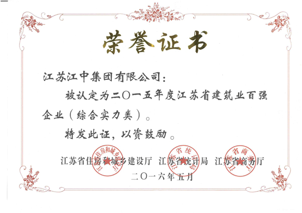 2016年6月13日,江蘇省住房城鄉(xiāng)建設(shè)廳、省統(tǒng)計(jì)局、省商務(wù)廳在南京聯(lián)合召開江蘇建筑業(yè)“走出去”暨百強(qiáng)企業(yè)發(fā)布會(huì)。江中集團(tuán)榮獲2015年度“建筑業(yè)百強(qiáng)企業(yè)”(綜合實(shí)力類)。副省長張雷出席會(huì)議并講話,省住房城鄉(xiāng)建設(shè)廳廳長周嵐出席會(huì)議,廳黨組書記、副廳長顧小平作工作部署。集團(tuán)黨委書記沈岳應(yīng)邀參加會(huì)議。
