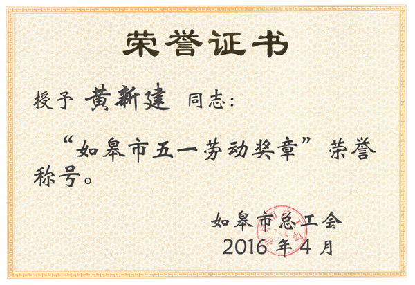 • 集團(tuán)沈忠星被授予“江蘇省勞動(dòng)模范”榮譽(yù)稱號 集團(tuán)黃新建被授予“如皋市五一勞動(dòng)獎(jiǎng)?wù)隆睒s譽(yù)稱號