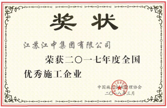 江蘇江中集團被評為“2017年度全國優秀施工企業”