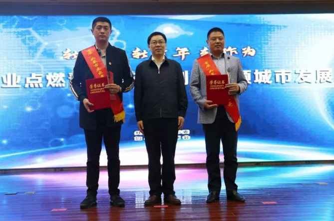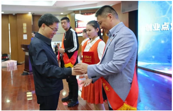 ▲市委常委、市委組織部部長、統戰部部長繆愛誠為沈鋒總裁頒獎