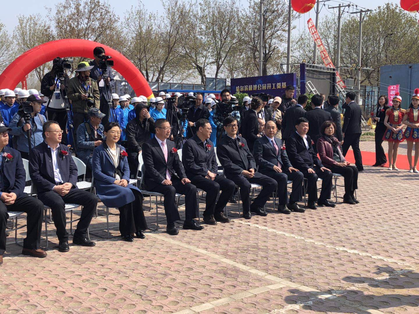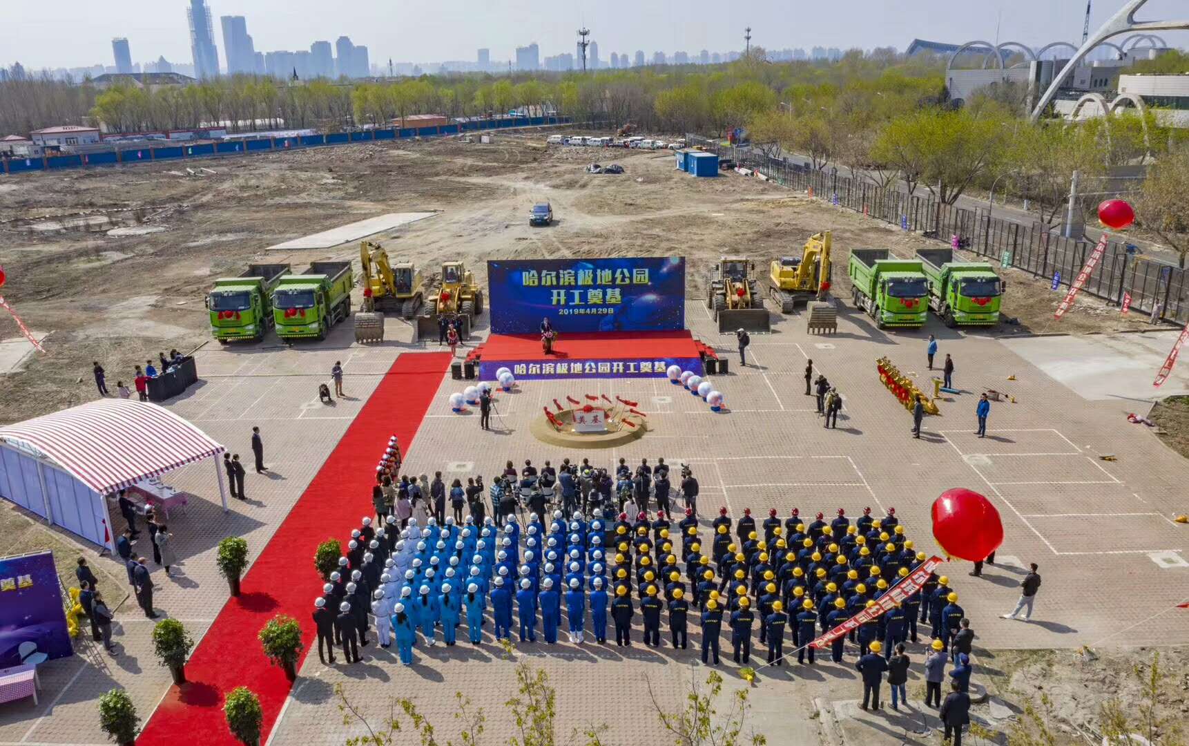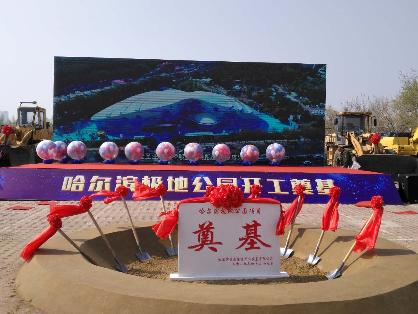 4月29日上午10時,彩旗飄舞,禮炮齊響,哈爾濱極地公園(極地館二期)開工奠基儀式隆重舉行。黑龍江省文化和旅游廳、哈爾濱市松北區人民政府、哈爾濱市文化廣電和旅游局領導、大連圣亞旅游控股總裁為項目奠基啟幕。我集團公司馬華董事長應邀出席奠基儀式,并與來賓一道手持金鍬,為項目培土奠基。集團東北公司極地公園項目部約100名員工統一著裝,共同見證了奠基儀式。