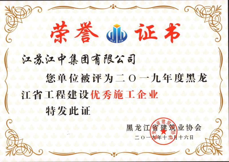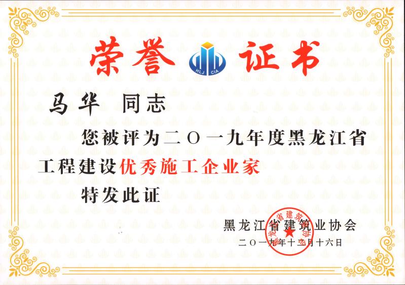 集團東北公司榮獲“2019年度黑龍江省工程建設優秀施工企業”榮譽稱號。集團董事長馬華榮獲“2019年度黑龍江省工程建設優秀施工企業家”榮譽稱號。