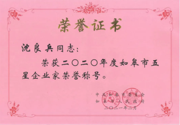 集團董事局主席沈良兵榮獲如皋市五星企業家