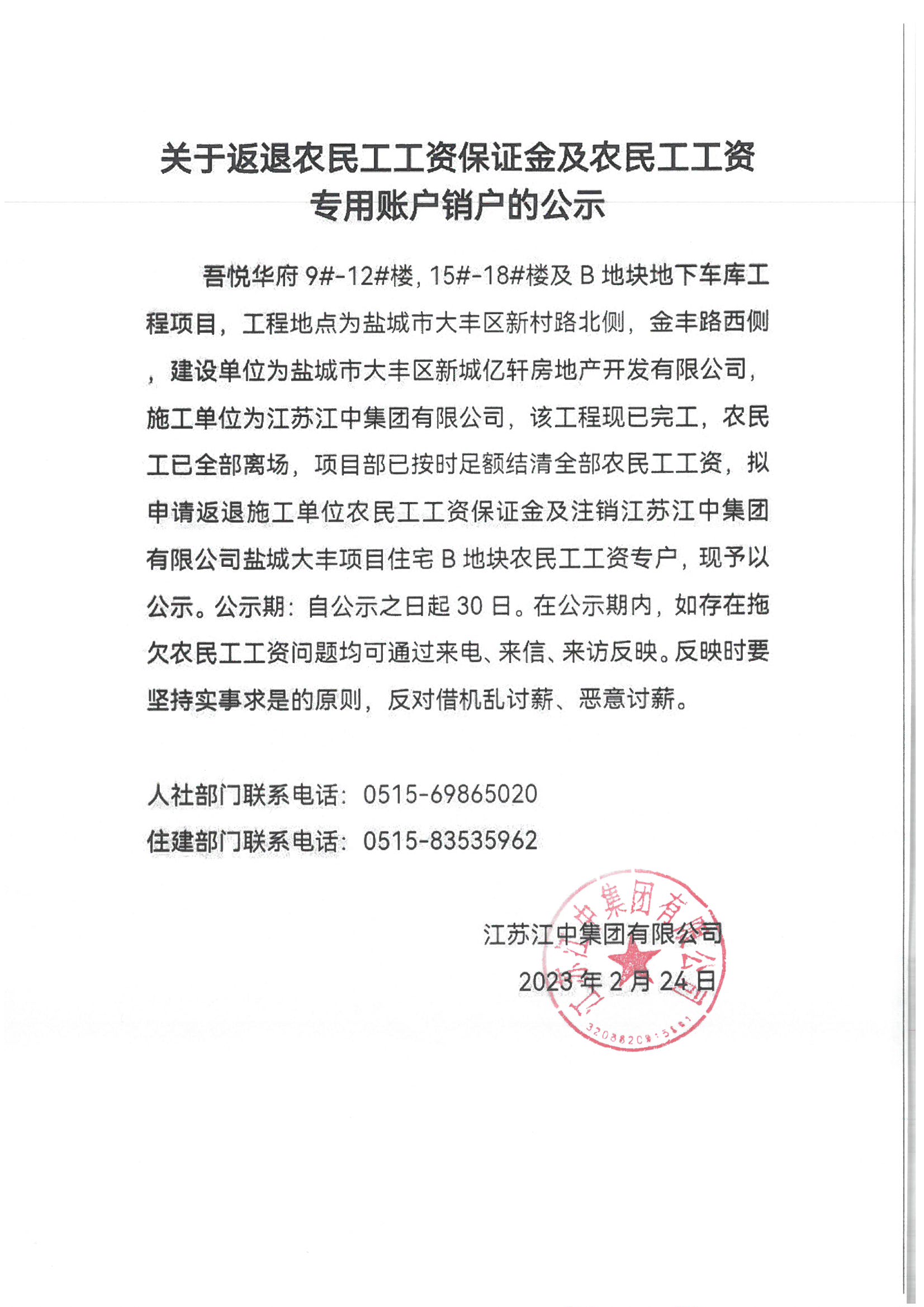 返退農(nóng)民工工資保證金及農(nóng)民工工資專用賬戶銷戶的公示